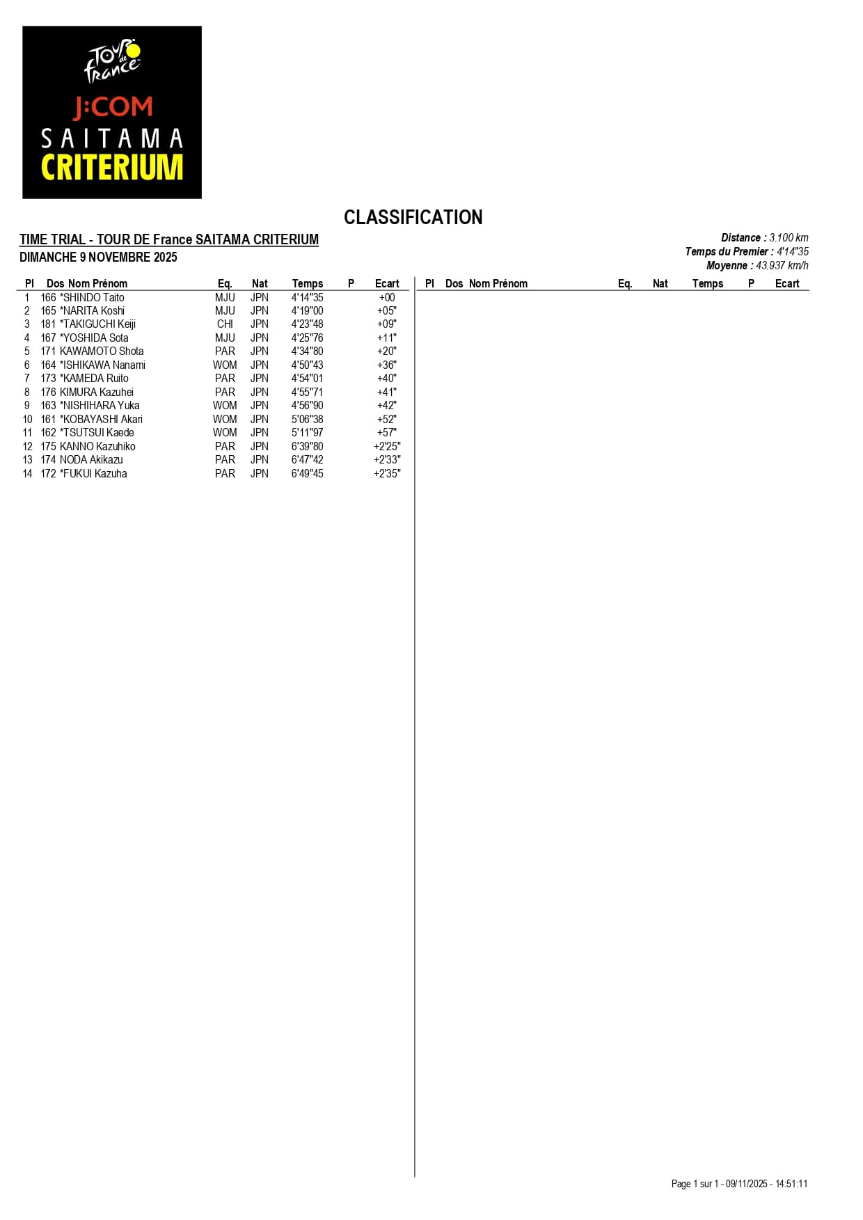 【速報版リザルト】タイムトライアルレース(個人) 25/11/9 レース タイムトライアルレース(個人)の結果です。 総合 次 一覧 前 「レース」に関連するお知らせ 【速報版リザルト】クリテリウムメインレース 25/11/9 レース 【速報版リザルト】タイムトライアルレース(チーム) 25/11/9 レース 【スタートリスト】J:COM presents 2025 ツール・ド・フランスさいたまクリテリウム 25/11/8 レース