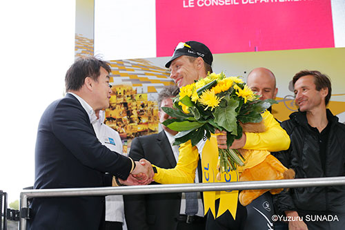 第6ステージのスタートセレモニーに過去ツール・ド・フランスで5回総合優勝を果たしている、ベルナール・イノー氏、大会ディレクターのクリスティアン・プリュドム氏らとともに登壇した。