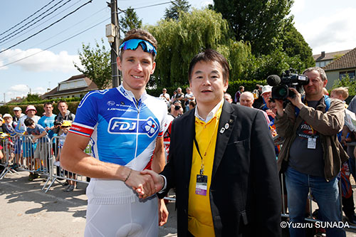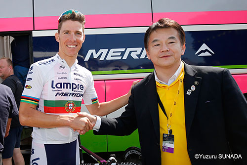 第6ステージのスタート前に、2014年さいたまクリテリウム ポイントレース2の優勝者である、アルノー・デマール選手(エフデジ所属)や2013年さいたまクリテリウムに出場したルイ・コスタ選手(ラン プレ・メリダ所属)を激励した。