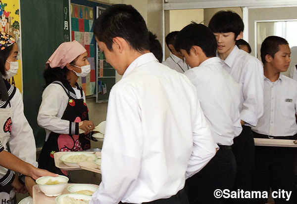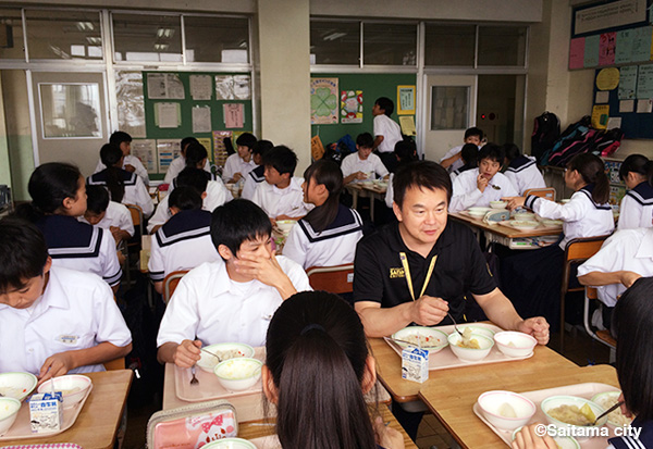 本日9月29日(火)、2015さいたまクリテリウム実行委員会会長(さいたま市長)清水勇人が、大宮西中学校(さいたま市西区)を訪問し、生徒達と一緒にクリテリウム開催記念給食を食べながら、フランスの食文化やさいたまクリテリウムについて話し、大会をPRするとともに交流を持ちました。