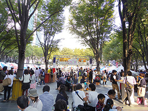 大会のもう一つの目玉、けやきひろばで同時開催されているさいたまるしぇの会場へ移動すると、トリコロールで彩られた会場には、いい匂いが漂っていました。