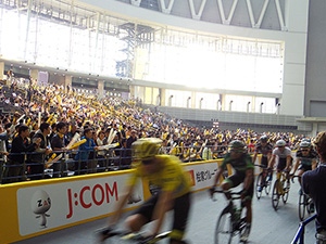 観客たちはパブリックビューイングでレースの状況を把握し、選手がさいたまスーパーアリーナ内のコース上に現れると、立ち上がって大声援!