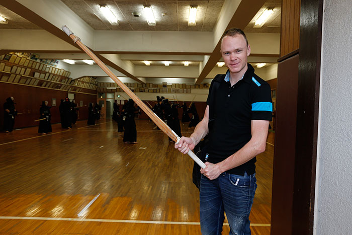 埼玉栄高等学校剣道部訪問時、見慣れない竹刀を手にして決めポーズを見せるクリス・フルーム選手