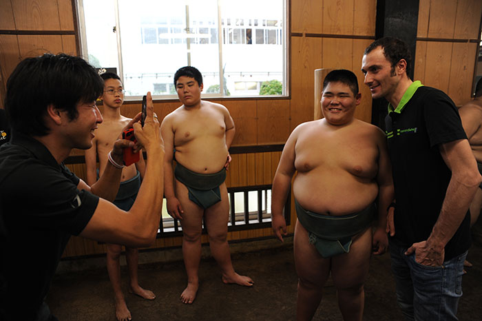 高校生力士と選手の記念撮影で、見事に笑顔を引き出す" 別府史之カメラマン"。