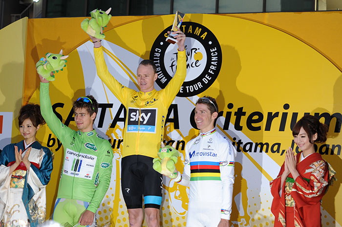 優勝はクリス・フルーム選手、2 位はペーター・サガン選手、3 位はルイ・コスタ選手がクリテリウムメインレースの表彰台を飾った。