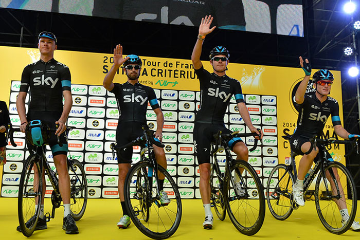 選手紹介では2013年覇者のクリス・フルーム選手率いるチーム スカイがステージからファンサービス。
