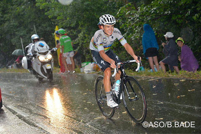 自転車レースでは世界チャンピオンになると特別のジャージを着るのでだれが見ても分かる。第12ステージで敢闘賞を獲得したミハウ・クビアトコウスキー。