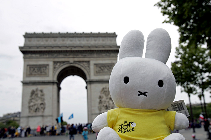 23日前に開幕地オランダのユトレヒトでツール・ド・フランスを祝福してくれたミッフィー。ボクの取材車両に乗って5000kmを走破し、パリの凱旋門で記念撮影。