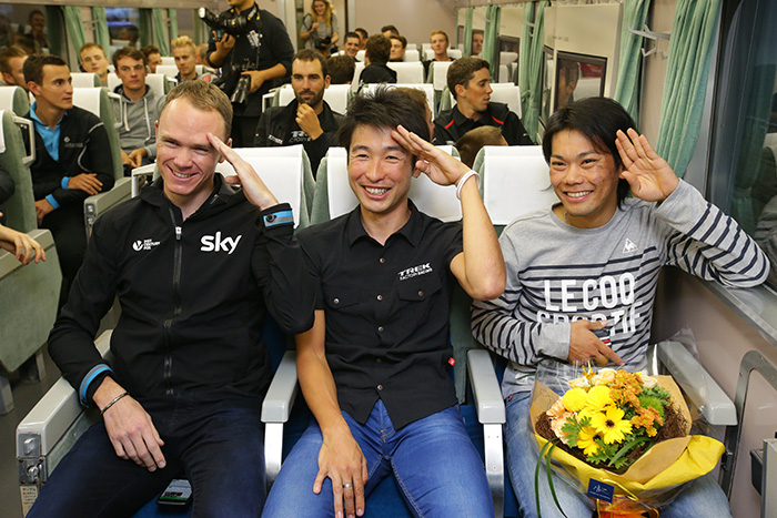 新幹線内でくつろぐ選手たち。(左から)フルーム選手、別府選手、新城選手。