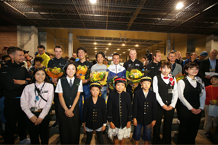 鉄道博物館の入り口前では、職員とさいたま市内の小学生から選手たちへ花束が贈呈され、記念撮影を行った。
