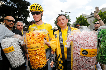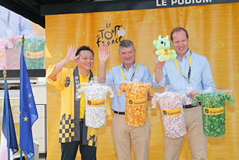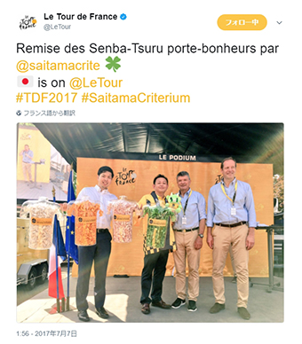 大会のPR企画として実施した「鶴 de France」(つる ど ふらんす)の「千羽鶴」を贈呈しました。A.S.O.大会ディレクターのクリスティアン・プリュドム氏へ手渡され、「ツール・ド・フランスさいたまクリテリウム」に4年連続で出場しているクリス・フルーム選手をはじめ、日本人で唯一出場をしている新城幸也選手にも手に取っていただき、折っていただいた皆様の思いを直接届けてきました。ツール・ド・フランス本大会で千羽鶴を贈呈するのは昨年に引き続き、2回目となります。