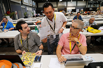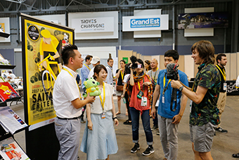 第6ステージフィニッシュ地点付近のメディアセンターへ訪問し、世界各国から取材に訪れているメディアに対し、英語で制作した大会チラシやステッカーを使用し、「さいたまクリテリウム」や「さいたま市」のPRを実施。和のコンセプトが目を引く大会メインビジュアルは、世界各国のメディアからも好評でした。