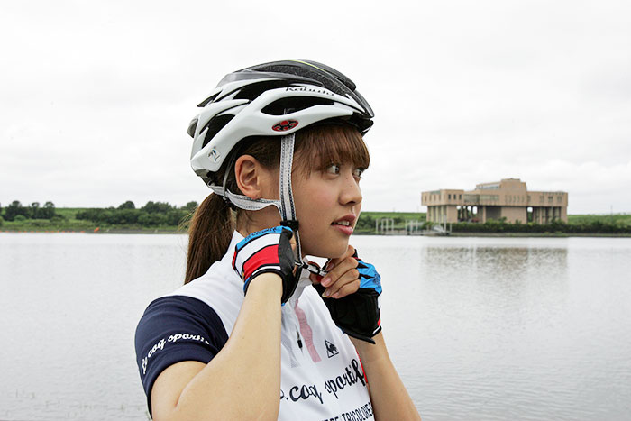 ヘルメット選びの大原則は自分の頭に合うサイズを購入すること。日本メーカーの「カブト」製品はサイズ展開が豊富なのでオススメだ。さらには正しく装着することがとても重要だという。目安としては、額が見えないくらいまぶかにかぶること。初めて着用する人、とりわけ女のコは麦わら帽子のように前部を上に向けてかぶりがちだが、これでは万一の落車時にヘルメットが備えた安全性や衝撃吸収性能が完全には機能しない。野球帽のように深くかぶって、あごひもの調節と後頭部にあるアジャスト機構を調節して動かないようにフィットさせる。