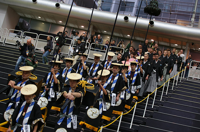 岩槻黒奴に先導されてさいたまスーパーアリーナに入場する海外選手達