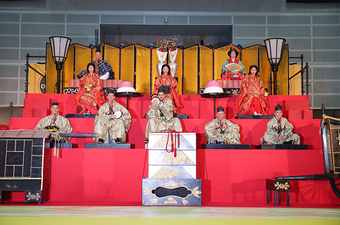 さいたま市出身の村田綾さんがお雛様、岩槻商業高校ソフトボール部の3名が三人官女に扮し、豪華な岩槻の人形ジャンボひな壇を再現