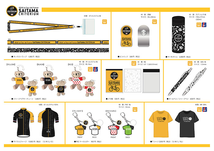 18/06/25商品情報2018さいたまクリテリウム実行委員会では、「J:COM presents 2018ツール・ド・フランスさいたまクリテリウム」のオフィシャルグッズ第一弾の販売を6月28日(木)からオフィシャルオンラインショップにて開始します。また、7月6日(金)からJ SPORTS オンラインショップにて、8月11日(土)からはロフト3店舗(さいたま新都心・大宮・浦和)にてそれぞれ販売を開始いたします。