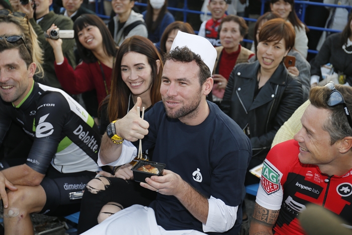 うなぎの蒲焼を試食し、満足した表情を浮かべるマーク・カヴェンディッシュ選手。
