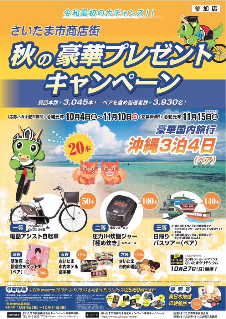 | 問合せ先 | さいたま市商店街活性化キャンペーン事業事務局 TEL:048-838-7701 (平日9時~17時まで/土日祝日は除く) |