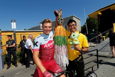 昨年の「鶴 de France」は、5月から折り鶴を開始し、会場では子供たちや自転車ファン、また、過去の大会にご協力いただいたさいたま市内の小学校にもご参加いただき、集まった4,096羽の折り鶴で、4賞ジャージ柄の「千羽鶴」が完成しました。完成した「千羽鶴」は、「ツール・ド・フランス2018」にて贈呈式を行い、出場する選手たちに直接届けることができました。選手や大会関係者は、参加した皆様の思いを笑顔で手に取ってくれました。
