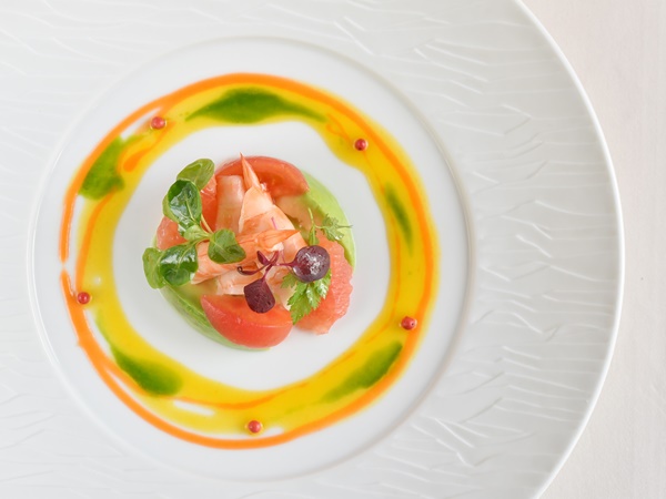 前菜は、車海老とホタテを柔らかく火を通し、当アルピーノ村で養蜂した蜂蜜を使ったドレッシングを使い味付けをいたしました。相性の良いアボカドやグレープフルーツと共に、サラダ仕立てのお料理です。