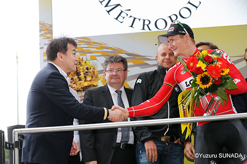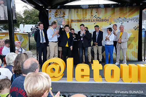 第6ステージのスタートセレモニーに過去ツール・ド・フランスで5回総合優勝を果たしている、ベルナール・イノー氏、大会ディレクターのクリスティアン・プリュドム氏らとともに登壇した。