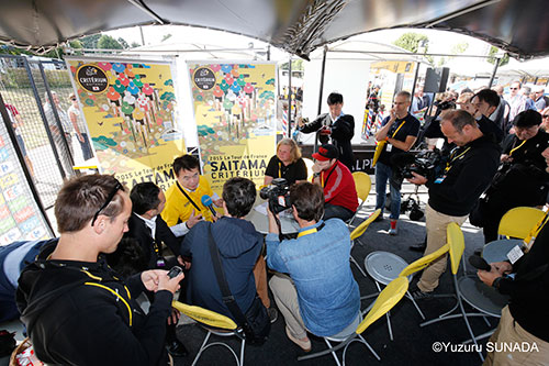 海外・国内メディアを対象に第6ステージのスタートヴィレッジにて取材を受けた。