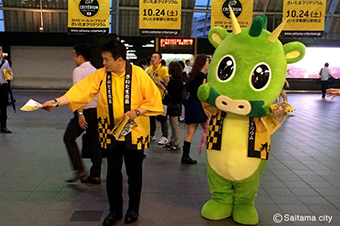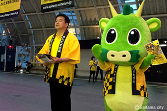 当日 には、清水勇人さいたま市長(2015さいたまクリテリウム実行委員会会長)等による大会開催告知のチラシ配布を実施いたしました。