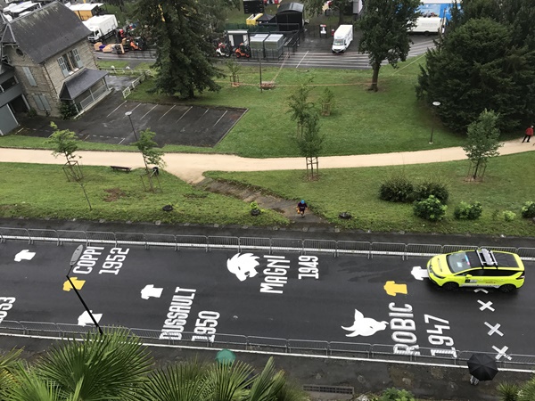 熱心なファンはキャンピングカーやクルマで沿道に乗りつけてベストポジションに陣取る。白いペンキ缶とローラーを取り出して、沿道に応援する選手の名前を描く。これが山岳ステージの風物詩ともなっている。
